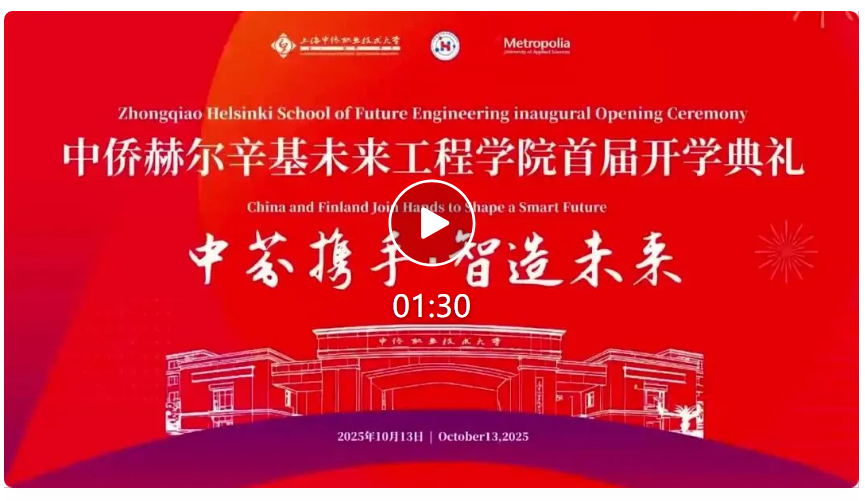 2025-11-07中芬携手,智造未来 | 中侨赫尔辛基未来工程学院开学典礼圆满举行金秋十月,桂香馥郁。在这满载希望与喜悦的时节,上海中侨职业技术大学迎来了里程碑式的重要时刻——中侨赫尔辛基未来工程学院首届开学典礼于 2025 年 10 月 13 日隆重举行。这场汇聚中芬两国教育力量的盛典,不仅是中芬教育深度融合的生动实践,更是以 “智造未来” 为目标的铿锵宣言,为国际化工程技术人才培养拉开了崭新序幕。让我们回顾一下现场:国风开篇:红幕映盛会,雅韵传文化典礼现场,签到处的红色背景板格外醒目,热烈的色彩如同中芬教育合作的蓬勃活力,预示着全新篇章的开启。来自中国、芬兰两国的校领导、嘉宾与师生代表齐聚一堂,共同见证这一历史性瞬间。为彰显中华优秀传统文化魅力,典礼以一场充满东方韵味的表演拉开帷幕。乐器演奏《寄明月》悠扬婉转,丝竹之音传递着中式浪漫;舞蹈《骁》轻盈灵动,舞姿间尽显东方美学。传统与现代在此交融,为这场国际范儿十足的开学典礼增添了浓厚的文化底蕴。领导致辞:擘画育人蓝图,共话合作未来开学典礼上,双方校领导的致辞为学院发展指明方向。上海中侨职业技术大学校领导赵斌率先发言,从学校办学理念与本土产业优势出发,明确阐述了学院培养 “国际化工程技术人才” 的坚定决心,强调将以产