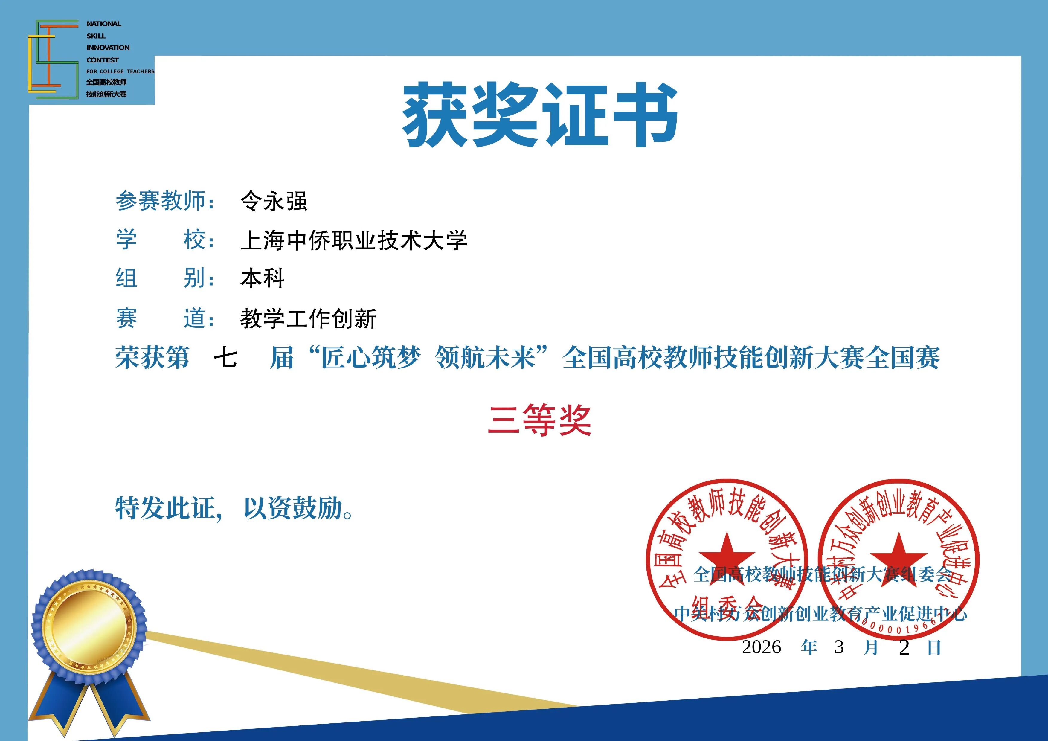 2026-03-09热烈祝贺我院令永强老师在第七届“匠心筑梦 领航未来”全国高校教师技能创新大赛中荣获三等奖近日,第七届 “匠心筑梦 领航未来” 全国高校教师技能创新大赛全国赛结果正式揭晓,赫尔辛基未来工程学院令永强老师凭借扎实的教学功底、创新的教学设计,在 “教学工作创新” 赛道脱颖而出,荣获全国三等奖,为学院斩获国家级教学竞赛荣誉!本次大赛由全国高校教师技能创新大赛组委会与中关村万众创新创业教育产业促进中心联合主办,是国内高校教师教学创新成果展示的重要国家级平台,吸引了全国多所高校的优秀教师同台竞技、切磋交流。比赛中,令永强老师以系统性的教学方案设计、丰富的教学实践积累为核心,带来了深度融合工程实践与跨学科思维的教学创新成果。其项目创新运用数字化教学工具重构课堂场景,紧扣 “以学生为中心” 的教学理念,在提升学生工程创新、团队协作及复杂问题解决能力方面形成了可复制、可推广的教学范式,凭借鲜明的工科特色和突出的创新价值,赢得了评委的高度认可。此次获奖,不仅是对令永强老师个人教学能力、创新精神与实践探索的充分肯定,更是赫尔辛基未来工程学院长期深耕教育教学改革、聚力推进 “新工科” 人才培养、践行 “产教融合、科教融汇” 办学理念的阶段性重要成果,彰显了学院在工程教育领域的前瞻性探索与教学团队 -