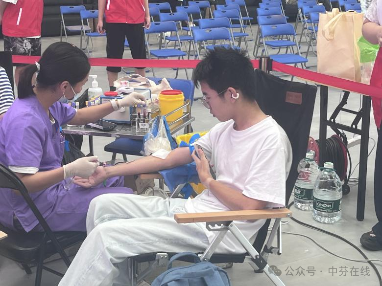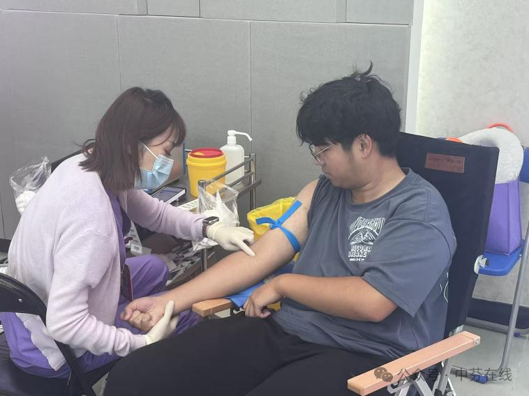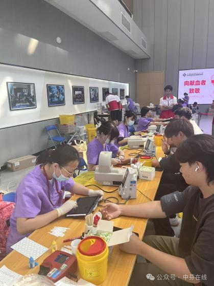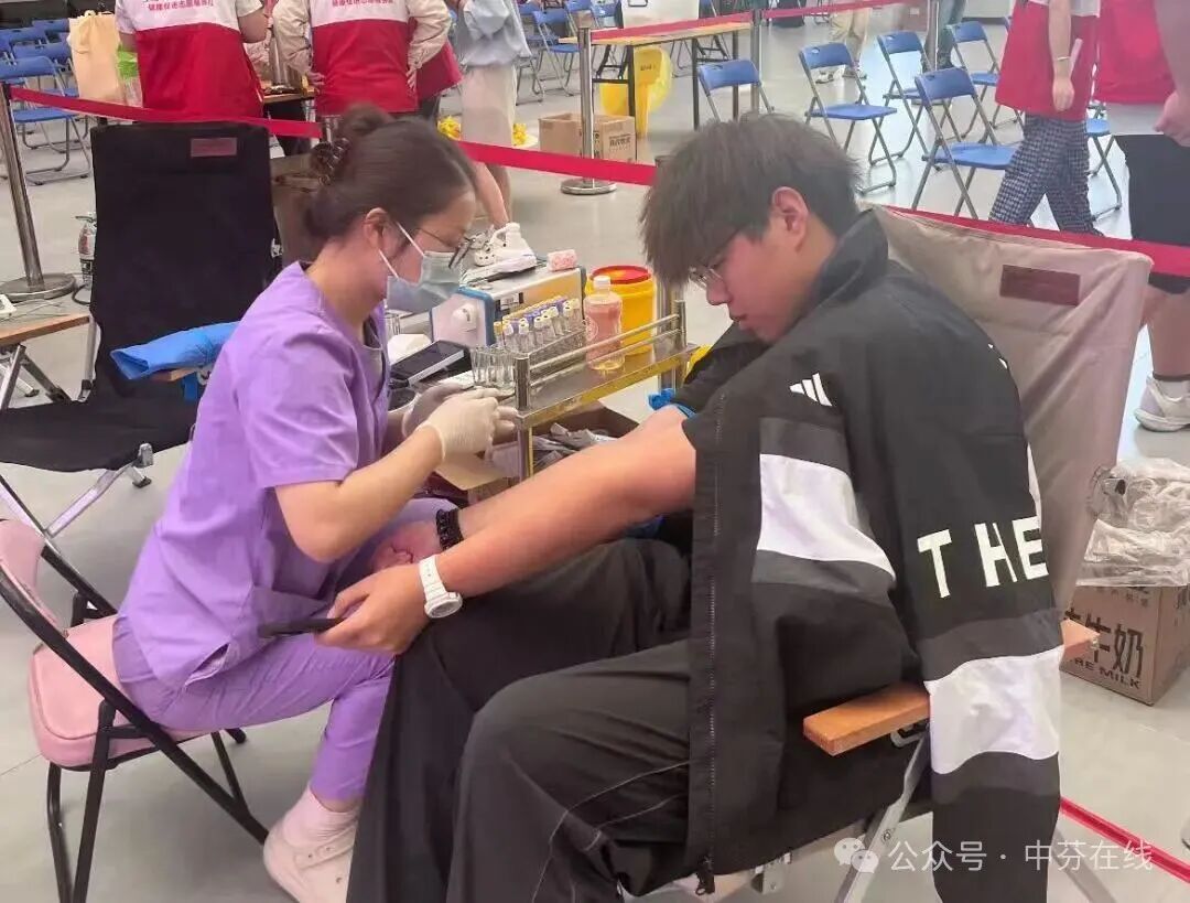 献血椅上,学生们无惧针头,他们初次尝试略显紧张却依然是坚定的“新鲜力量”。