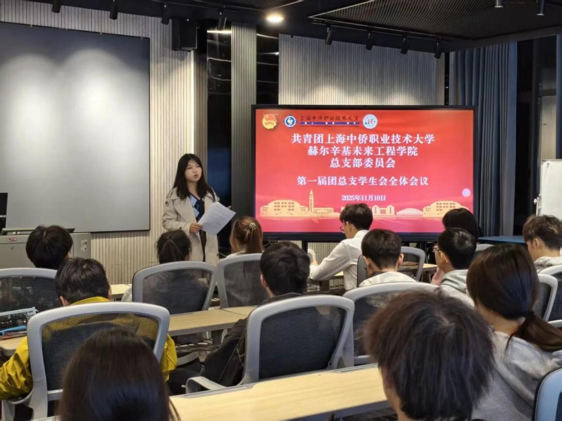 2025年11月10日下午,共青团上海中侨职业技术大学赫尔辛基未来工程学院总支部委员会第一届团总支学生会2025-2026学年第一学期干部工作会议在26号楼210教室顺利召开。本次参会人员有学院团总支委员会副书记伍阳阳、团总支委员会学生副书记唐妤熙、肖文婧,主席团成员王曦元、李宇鑫以及团总支学生会各部门全体成员。本次会议由团总支委员会副书记伍阳阳老师主持。