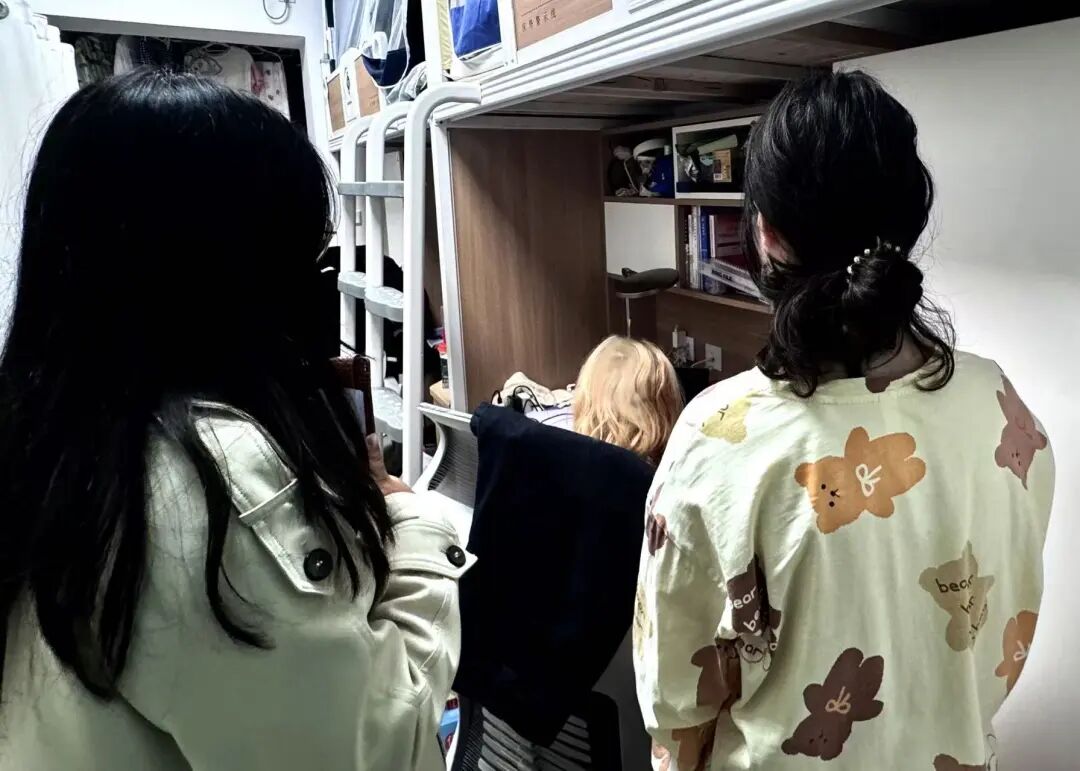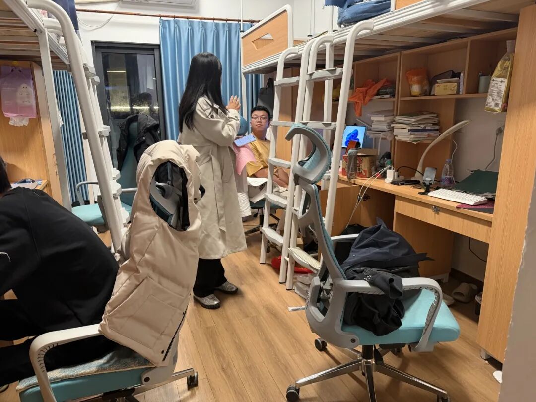 检查期间,伍老师走进学生宿舍,重点关注用电安全与卫生状况。她细致检查宿舍环境,认真查看了各宿舍地面、桌面、床铺等区域的清洁卫生情况,强调共同维护整洁的居住环境。在安全方面,伍老师也逐一排查安全隐患,强调严禁使用违规电器,不得在宿舍内饲养宠物,并提醒同学们遵守校规校纪,严格执行夜不归宿报备制度,保障每位同学的人身安全与信息可追溯,确认人身安全。