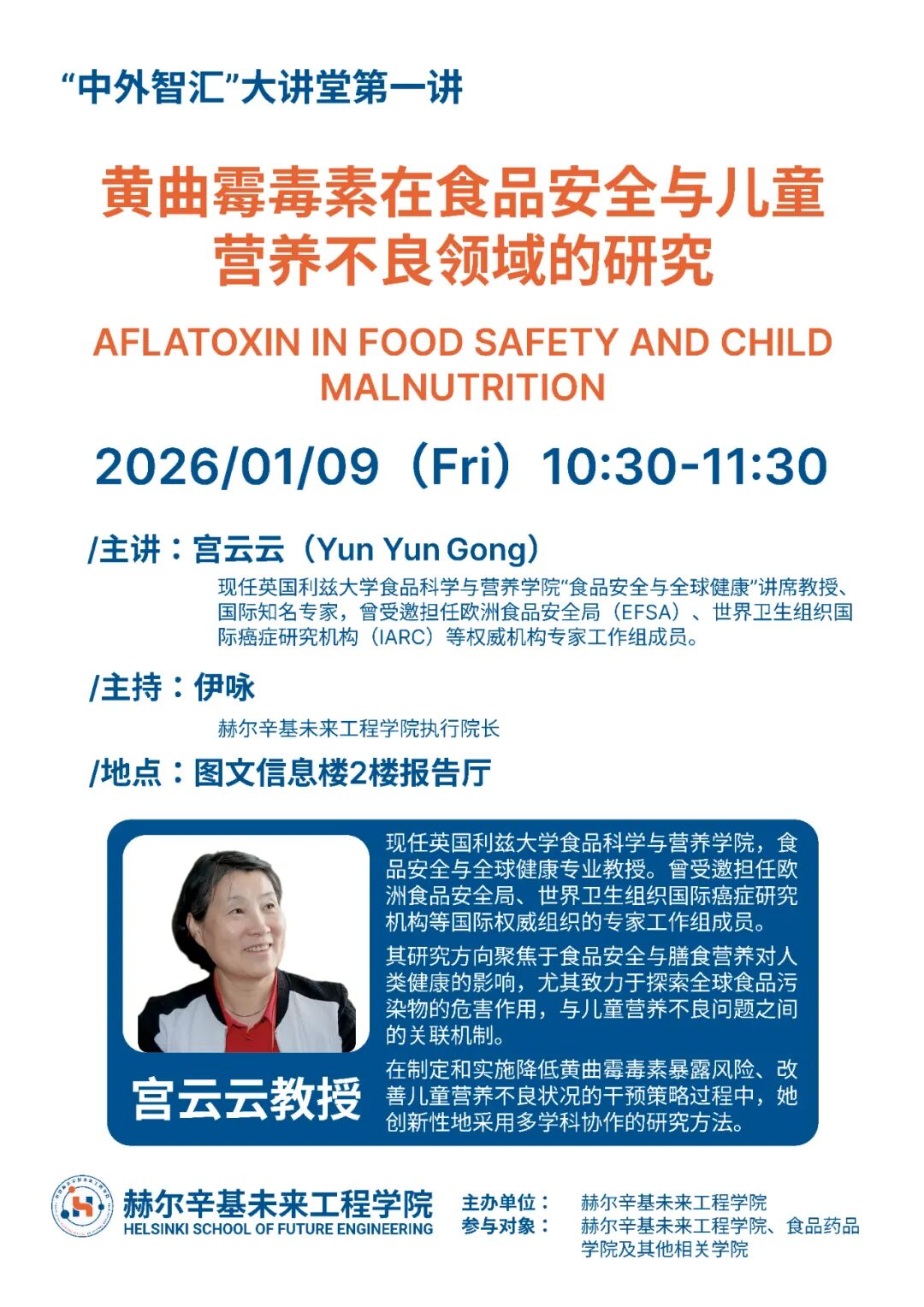 赫尔辛基未来工程学院“中外智汇”大讲堂于202619日正式开讲!首期特邀英国利兹大学食品科学与营养学院,食品安全与全球健康专业教授宫云云(Yun Yun Gong),围绕“黄曲霉毒素在食品安全与儿童营养不良领域的研究”展开专业分享,为赫尔辛基未来工程学院、食品药品学院及其他相关学院师生开启一场贯通食品安全与全球健康的学术分享。