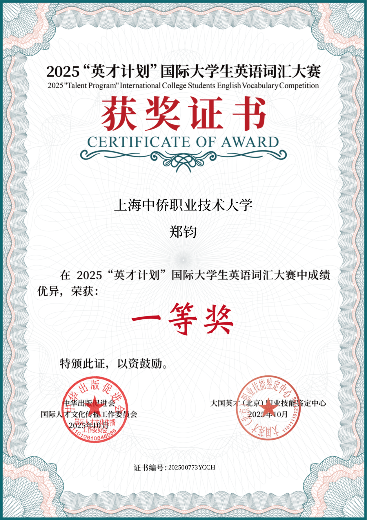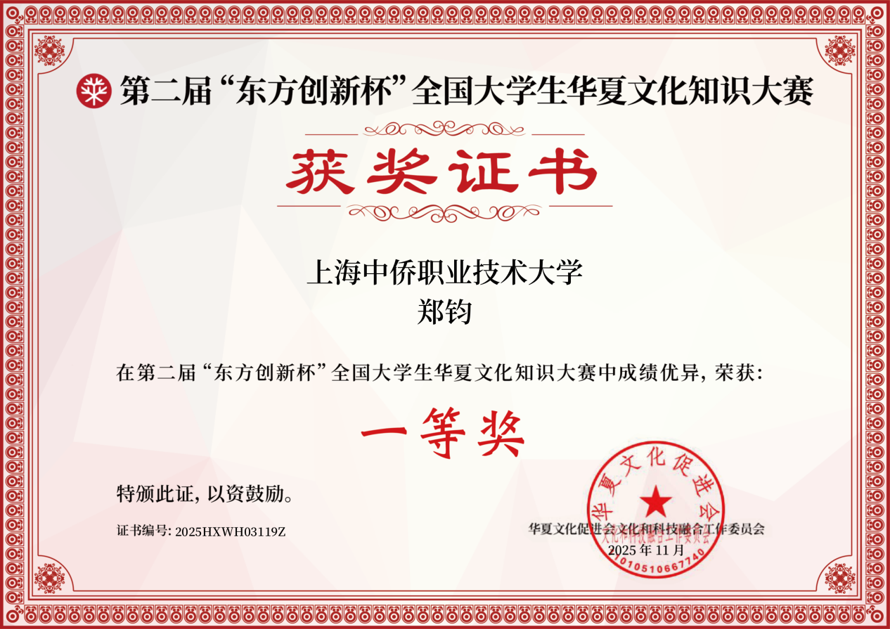 上海中侨职业技术大学赫尔辛基未来工程学院学生郑钧凭借扎实的知识储备与出色的综合素养,在两项高水平赛事中脱颖而出,分别斩获2025“英才计划”国际大学生英语词汇大赛一等奖与第二届“东方创新杯”全国大学生华夏文化知识大赛一等奖,展现了我院学子在语言能力与文化素养上的双重实力。