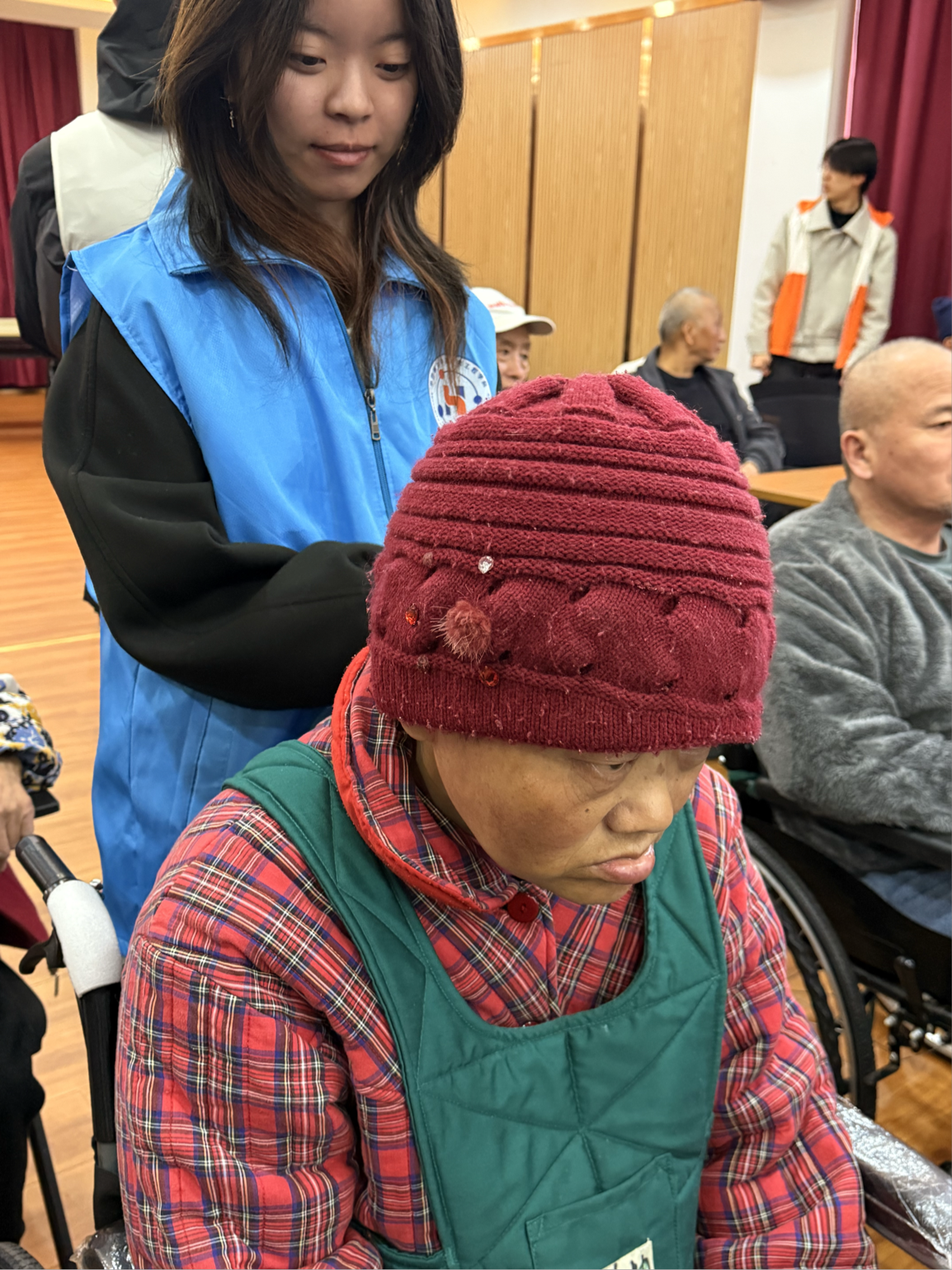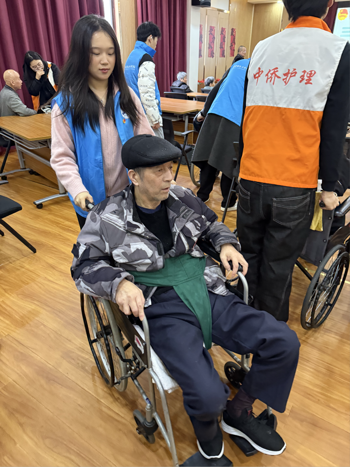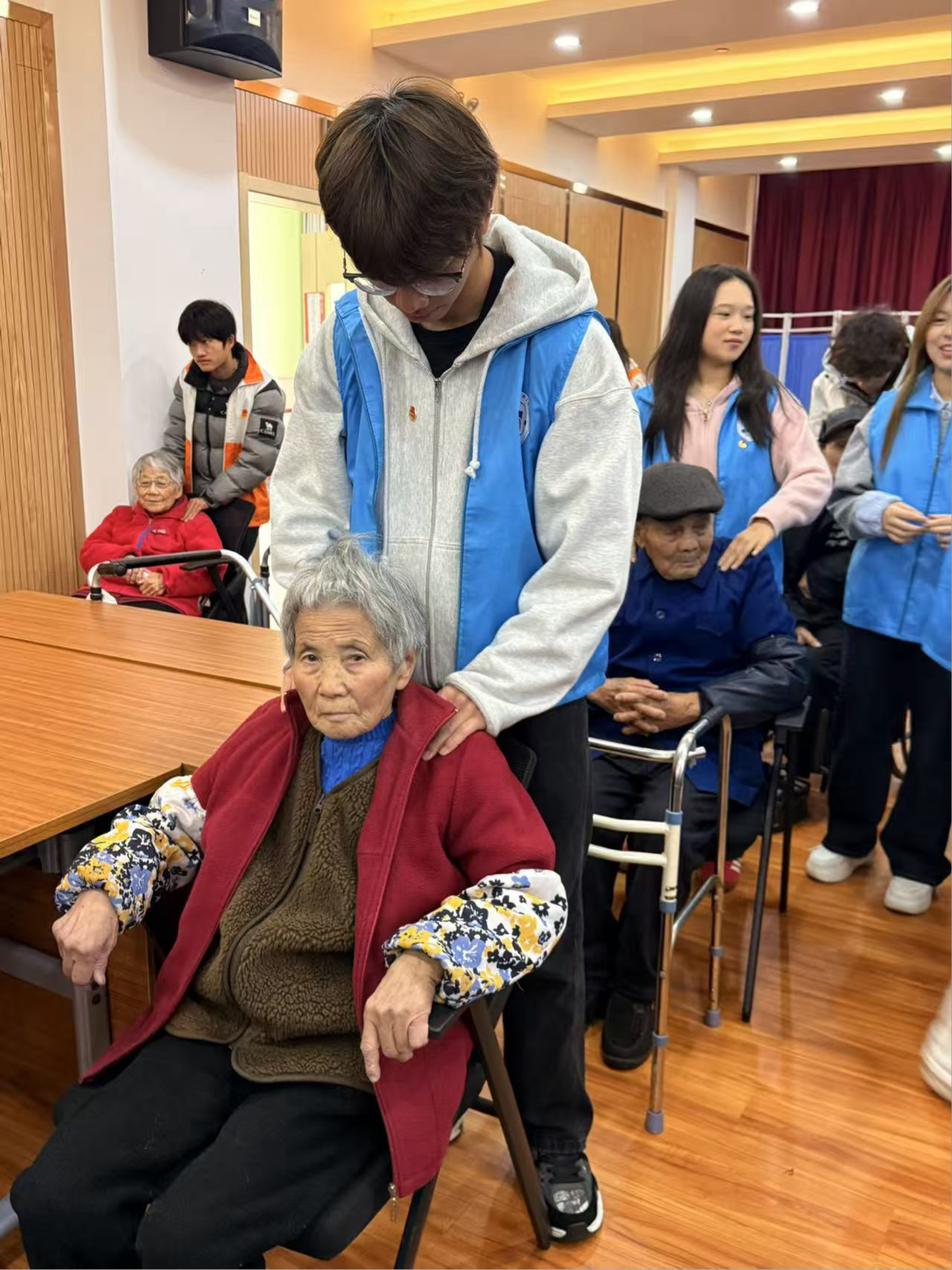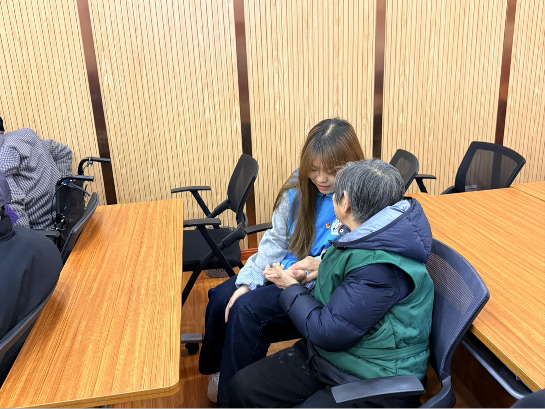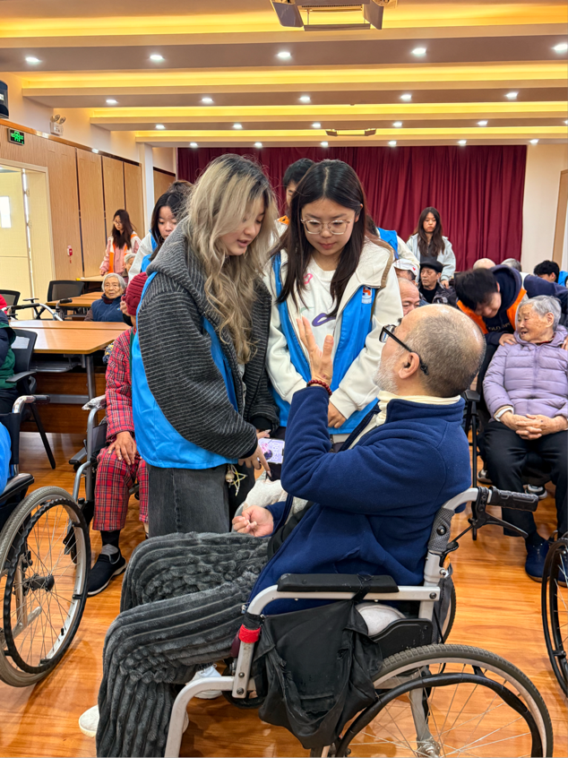 文艺互动结束后,两院青年携手为老人提供肩颈腰背推拿按摩,缓解身体疲惫。中芬青年主动与老人闲话家常,用简单的双语问候、耐心的倾听陪伴老人,让跨文化的温暖化作家人般的关怀。活动尾声,全体青年志愿者与老人合影留念,共同整理活动现场、打扫卫生,以严谨的作风为本次特色志愿服务画上圆满句号。