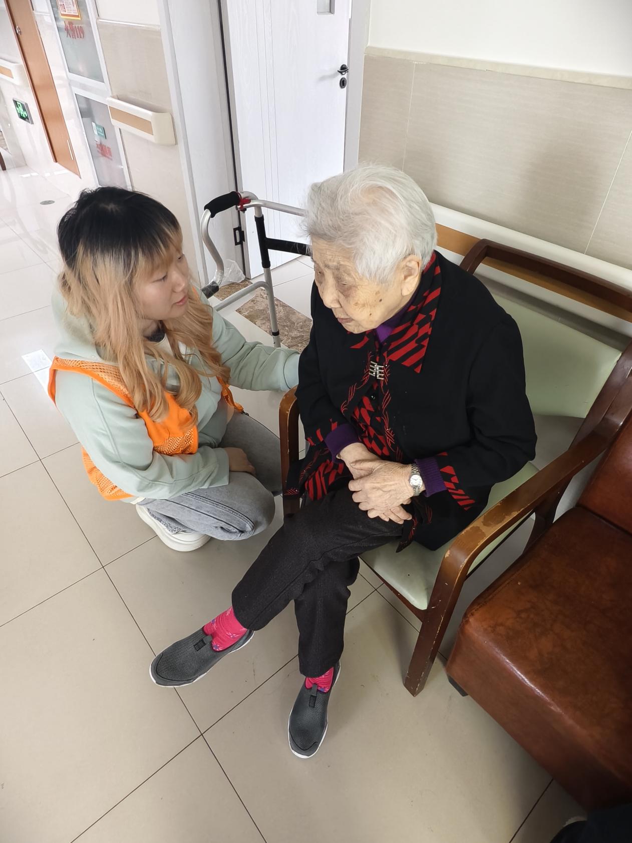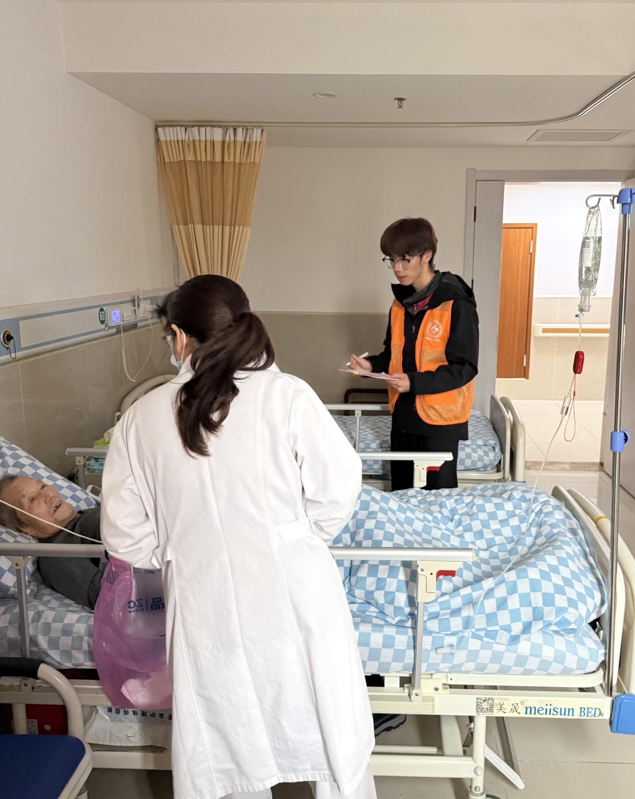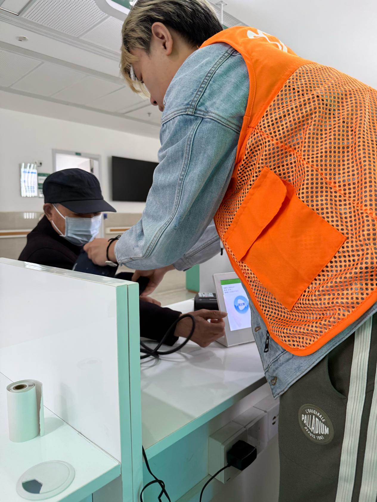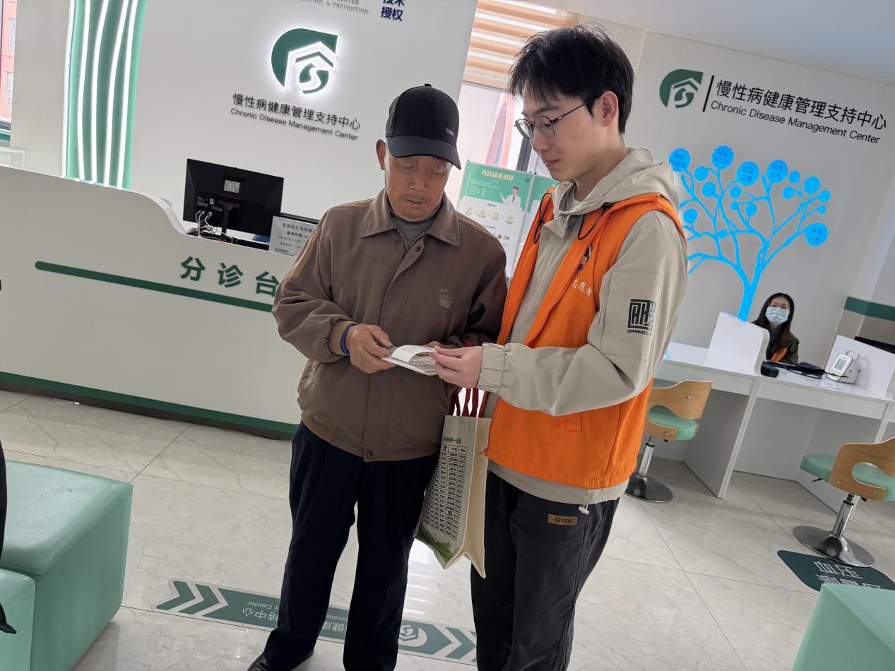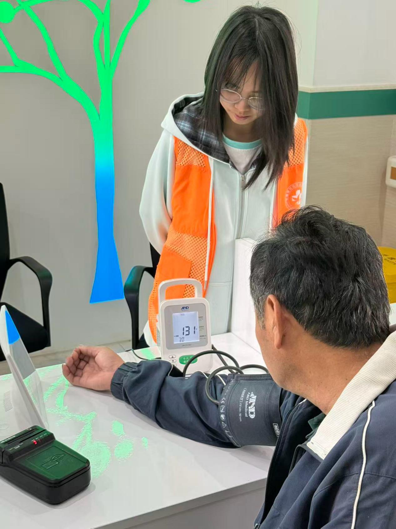 一部分同学负责引导岗位,指引体检路线、维持现场秩序,并耐心解答居民咨询的各类问题,用高效的配合保障了现场流程顺畅有序;另一部分同学积极协助现场护士,为居民及护理院老人测量血压并认真做好健康数据登记,以细致周到的服务为老人传递温暖与关怀。